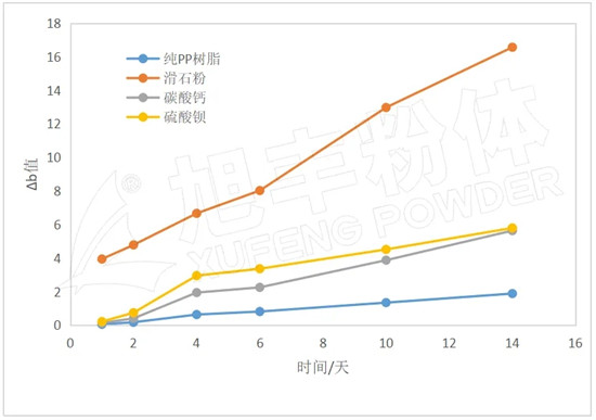 上圖是純PP樹脂、滑石粉填充PP、碳酸鈣填充PP和硫酸鋇填充PP在150℃的烘箱中老化實驗,隨著熱老化天數(shù)的增加,其Δb值(耐黃變)的變化。由圖可知: