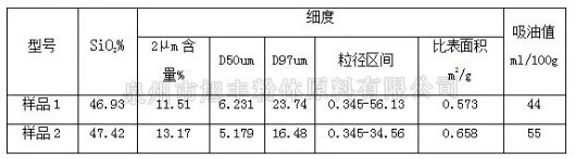 挑選樣品1和樣品2兩款相同礦石,不同細(xì)度的滑石產(chǎn)品,進行檢測對比,由下表的檢測數(shù)據(jù)可知:滑石粉的粒徑越細(xì),比表面積越大,粒徑分布區(qū)間越窄,吸油值越高。