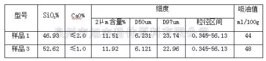 滑石粉中的二氧化硅(SiO2)含量也是影響其吸油值的主要因素之一,選取樣品1和樣品3兩款相同細(xì)度,不同硅含量的滑石產(chǎn)品,進行檢測對比,由下表的檢測數(shù)據(jù)可知:原礦二氧化硅含量越高,碳酸鈣等雜質(zhì)含量越低,吸油值越高。